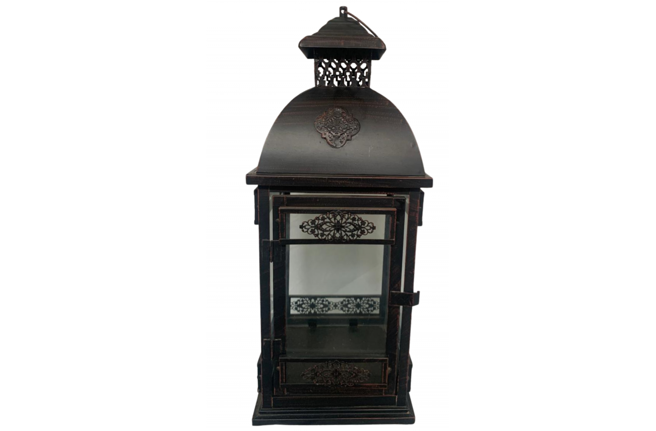 Lanterna decorativa grande em ferro escuro. Medidas: 48cm altura x 19cm largura