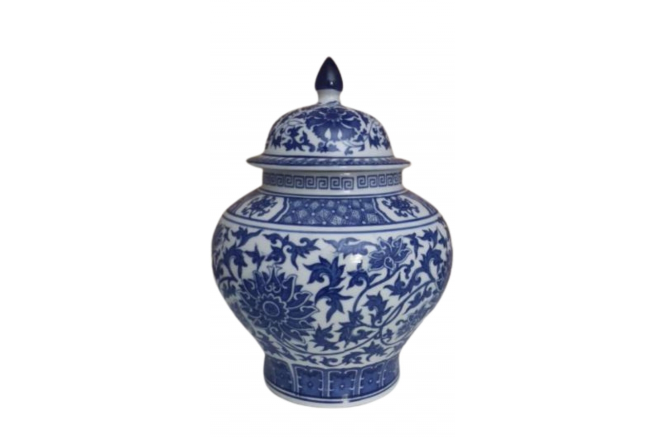 Pote gordo médio branco e azul floral. Medidas: 19cm altura x 12cm boca