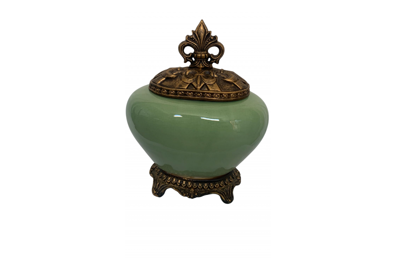 Pote verde em cerâmica e acabamentos dourados em resina pequeno. Medidas: 30cm altura x 16cm boca